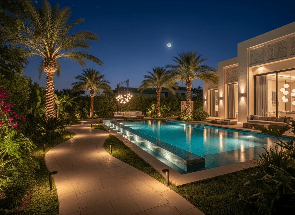 Bring outdoor spaces to life with stunning landscape and architectural lighting. We create magical evening environments for gardens, pools, pathways, and facades.
